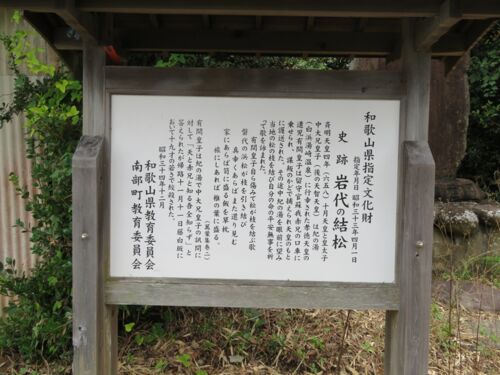 ●歌は、「岩代の浜松が枝を引き結びま幸くあらばまた返り見む (一四一歌)」ならびに「家なれば笱に盛る飯を草枕旅にしあれば椎の葉に盛る(一四二歌)である。 有間皇子結松記念碑解説板万葉歌碑(プレート) 20210913撮影 ●歌碑(プレート)は、…