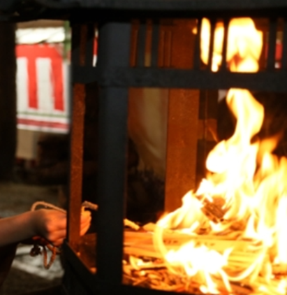 午後7時から本殿にて一年を締めくくる除夜祭が執り行われ、祭典後には境内に設けられた灯籠に順次、神職により浄火が点火されます。その際に白朮(をけら)の欠片と氏子崇敬者が一年間の無病息災を祈願した『をけら木』が一緒に炊き上げられます。