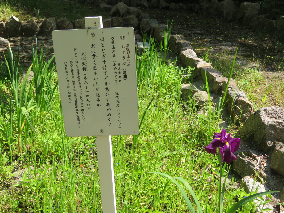 歌碑(プレート)の植物名は、「はなしょうぶ・しょうぶ(菖蒲)」、万葉集花名「あやめぐさ」・現代花名「ショウブ」と書かれている。