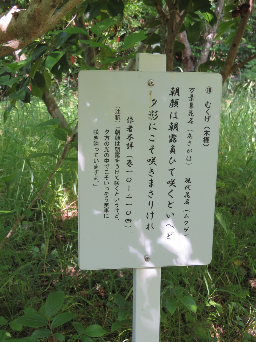 歌碑(プレート)の植物名は、「むくげ(木槿)」、万葉集花名「あさがほ」・現代花名「ムクゲ」と書かれている。
