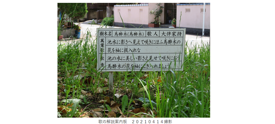 (訳)お池の水の面に影までくっきり映しながら咲きほこっている馬酔木の花、ああ、このかわいい花をしごいて、袖の中にとりこもうではないか。(伊藤 博 著 「万葉集 四」 角川ソフィア文庫より)