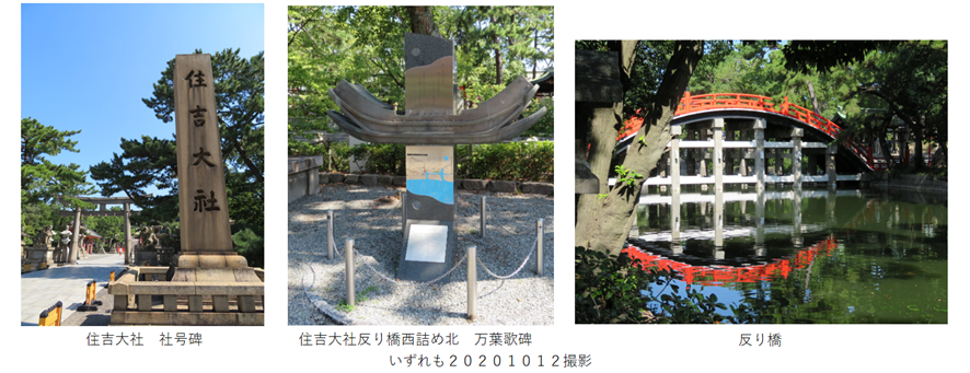 この住吉大社反り橋西詰め北にある歌碑は、「住吉万葉歌碑」と言われ、万葉時代を推定する住吉地形図とともに万葉歌十七首が刻されている。